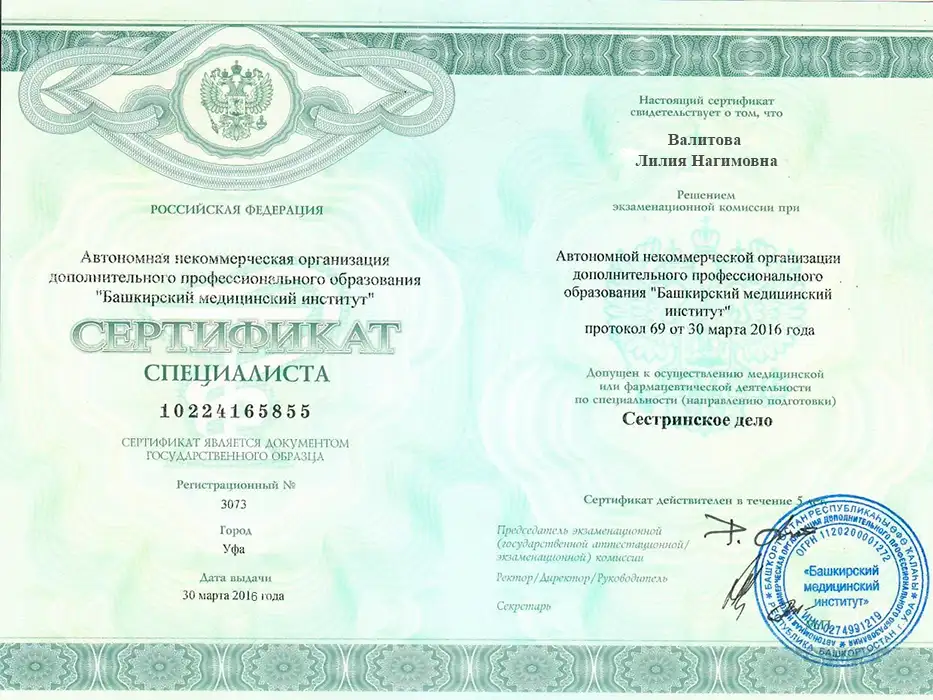 • 2016 – Башкирский государственный медицинский институт – аккредитация по специальности "лечебное дело", 2016, 2020 г.г.
